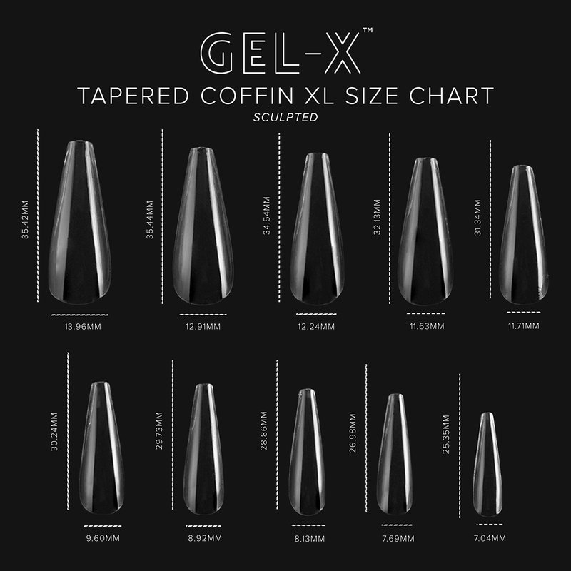 Get ready to experience the tips that revolutionized the industry. One box includes 10 sizes, total of 250 pieces. All of our Gel-X tips are carefully molded from our patented soft gel formula to provide the most comfortable and lightweight nail enhancements on the market. Just as easy to use as it is easy to wear, our Gel-X tips are applied with our Apres Extend Gel and can provide 4+ weeks of beautiful, strong nail extensions. Made of soft gel, Gel-X can be quickly soaked off with acetone, reducing the dangers of overfilling or harmful chemicals. Style: Sculpted Shape: Coffin Length: Extra Long While our Sculpted line is considered our universal fit, it specifically caters to those with a more curved nail bed and a more pronounced C curve.