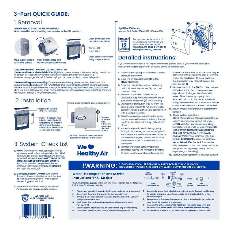 - BUY WITH CONFIDENCE This genuine replacement water panel was designed and manufactured in the USA by AprilAire – the leader in indoor air quality solutions to optimize the performance of your AprilAire Humidifier Model: 110, 220, 500, 500A, 500M, 550, 550A, 558