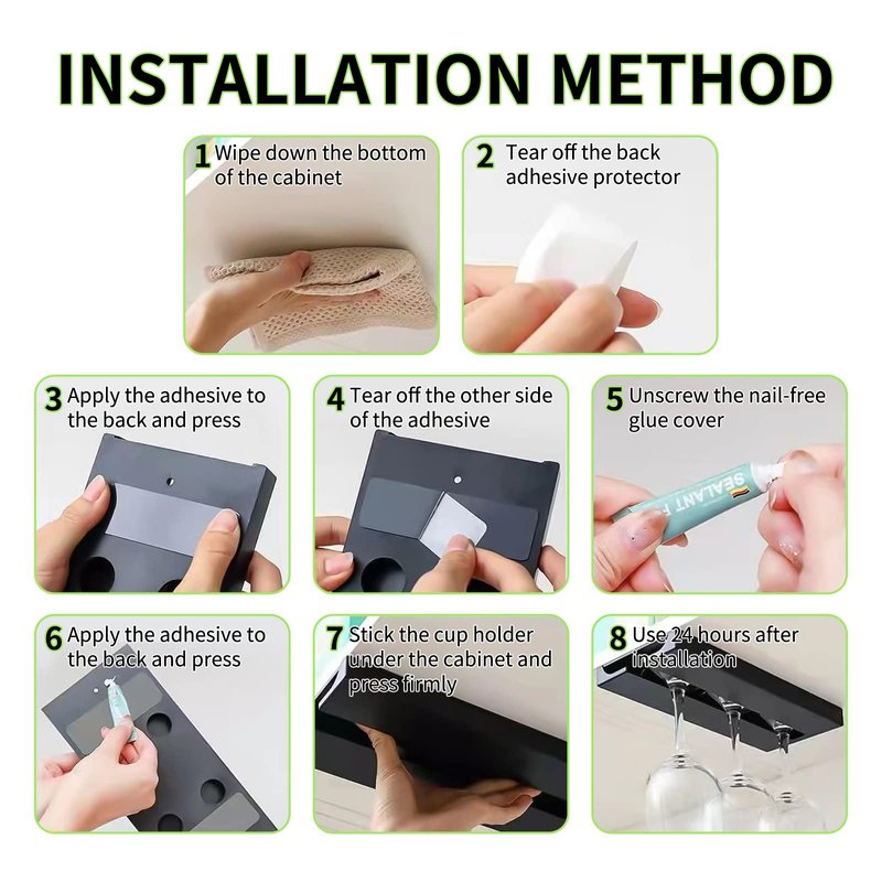 Note: The tape of the wine glass holder must be glued to the flat and smooth surface of the closet. It is best to wait two hours before placing the cup after it is glued. Remember to try to see if it is firm before placing it.