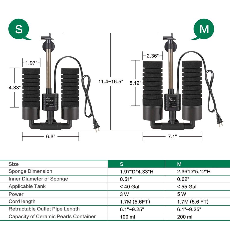 AQQA Aquarium Electric Power Sponge Filter,3W/5W Silence Submersible Foam Filter,Sponges Bio Ceramic Media Balls Double Filter for Saltwater Freshwater Fish Tank (S)