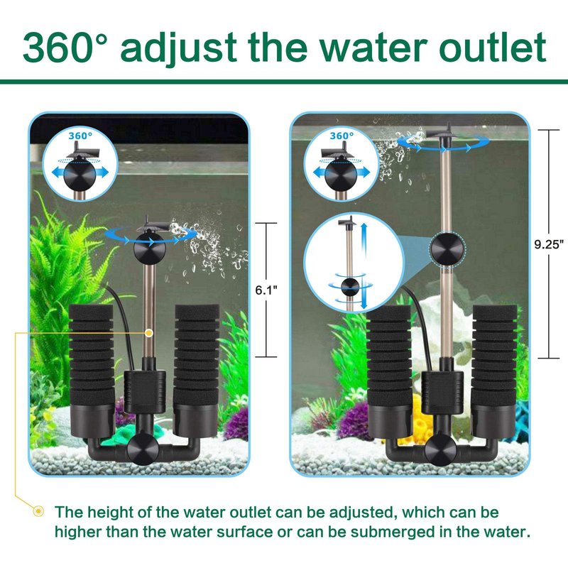 - 【Water Outlet Can be Adjusted 360°and Stretch】The retractable water outlet can be adapted to fish tanks of various depths, and the water outlet can be submerged in the water or out of the water.Filtration can not only purify water quality and increase water circulation, but also increase the oxygen content in the water.