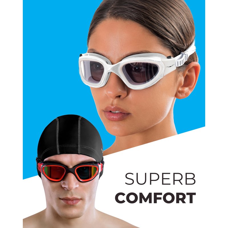 Designed with the swimmer's comfort in mind, the goggles boast soft silicone seals that gently conform to the contours of your face, ensuring a snug fit without excessive pressure. The ergonomic 3D frame minimizes water resistance and fits a wide range of face shapes, providing an enhanced swimming experience without discomfort.