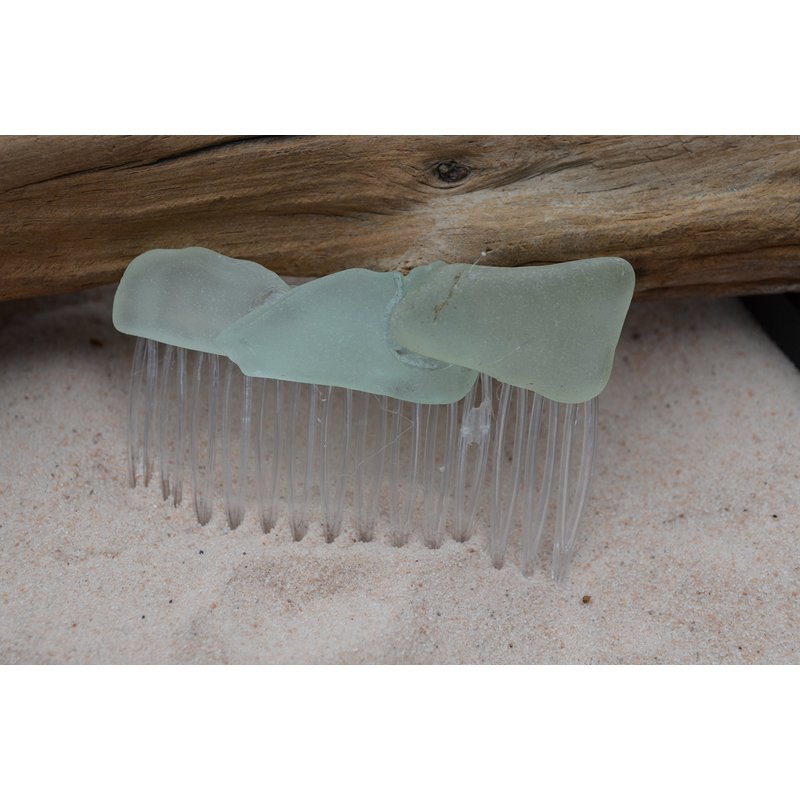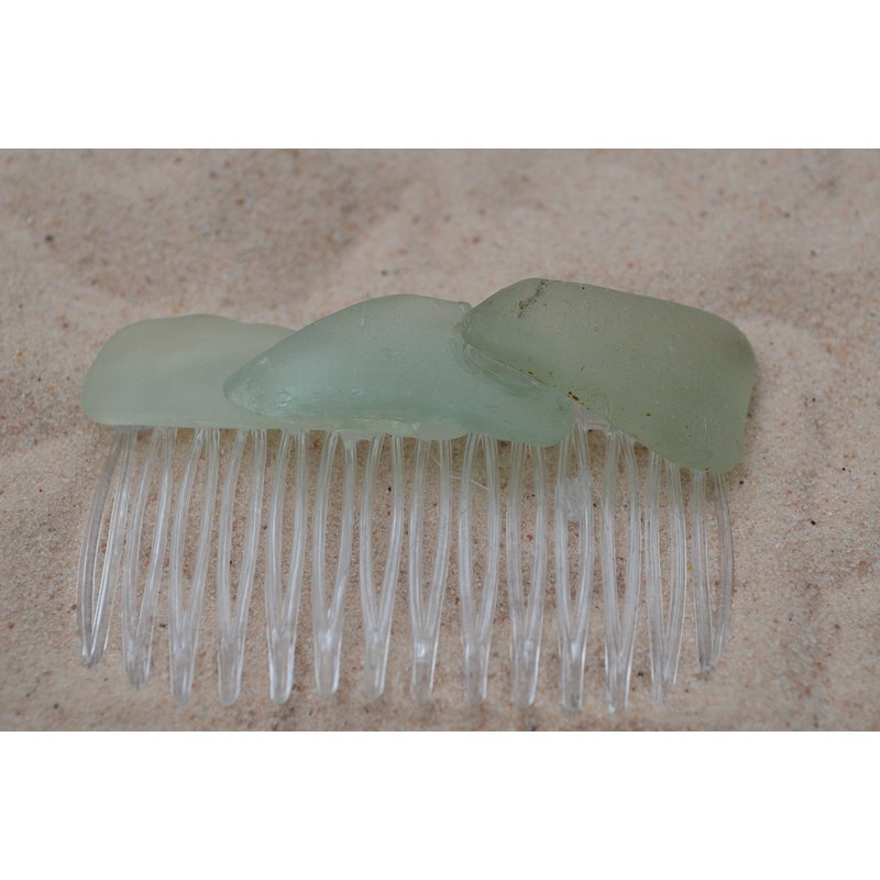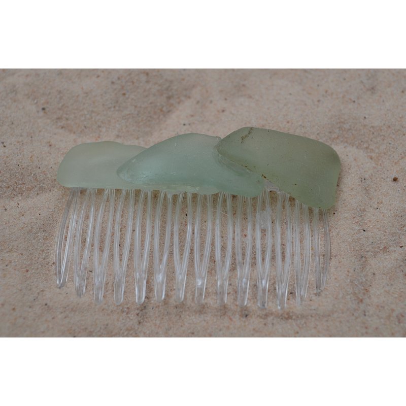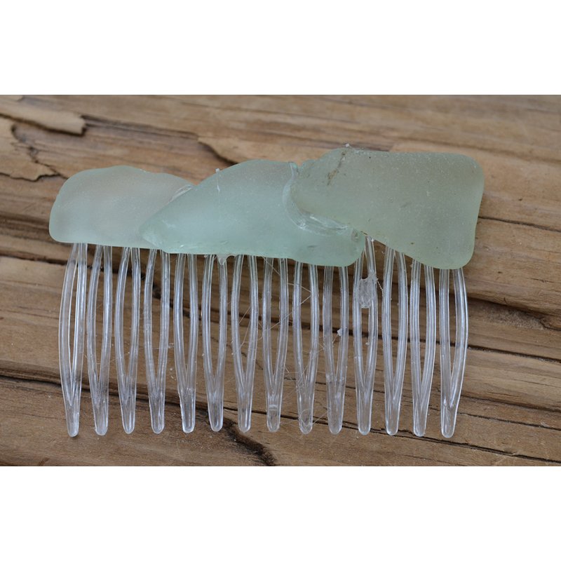 Lovely aqua, frosted sea foam sea glass hair comb. The ligtly colored frosted beach glass adorns an acrylic hair comb. The hair comb is perfect for a beach wedding or just frolicking in the surf while enjoying a day at the beach. The hair comb is handmade. Each piece of sea glass was carefully selected for its unique and compelling ocean shades and shapes, combined the pieces of sea glass create a lovely hair comb. The sea glass is genuine and was collected on the rocky shores and sandy beaches of Casco Bay, Maine. The sea glass has a lovely natural frosted surface as a result of the glass being tossed about the ocean waves and sandy shores for a number of years. The hair comb is made in the USA and comes from a smoke free environment. The hair combs measure: 67 mm x 41 mm or 2.65 inches x 1.6 inches