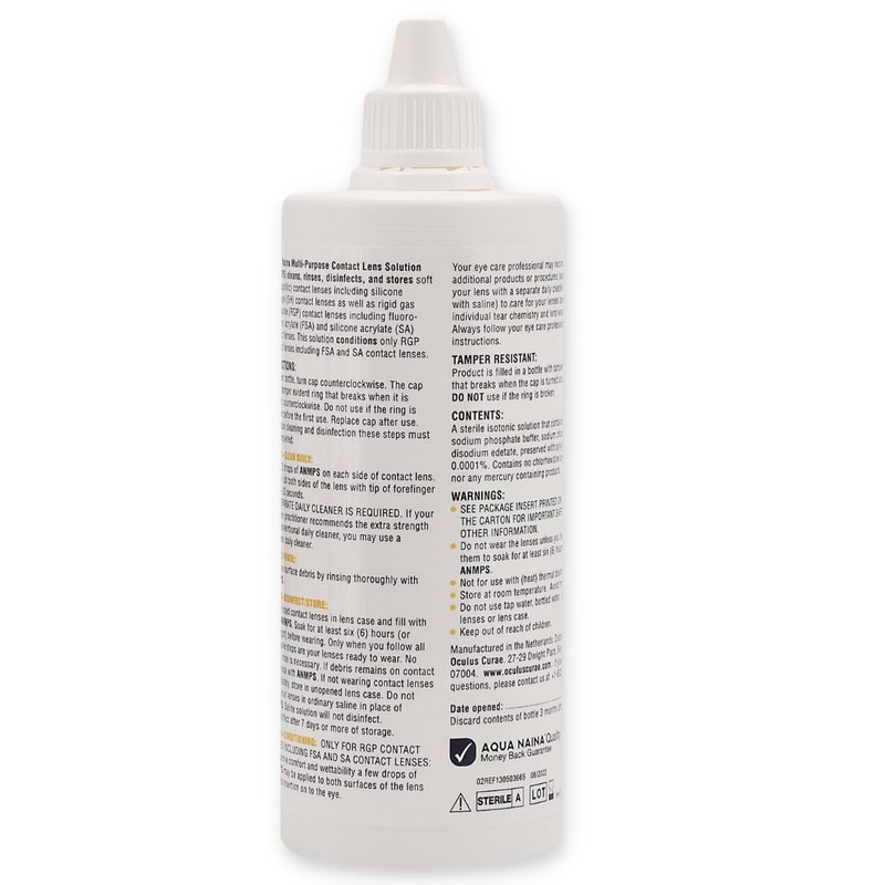 - SAFE BOTTLE DESIGN: Aqua Naina contact lens cleaning and disinfecting solution has a recyclable, safe bottle design with a tamper-proof ring cap and a tapered tip for perfect control while dispensing.