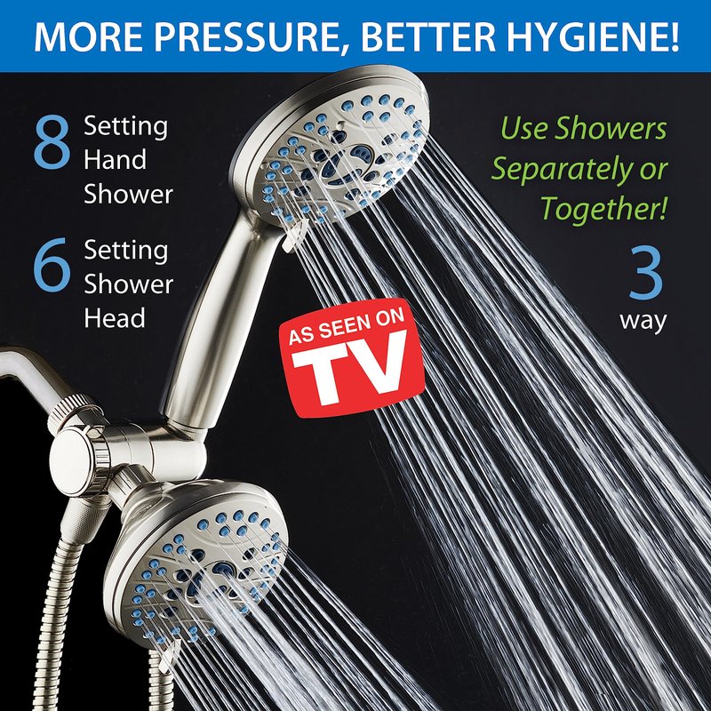 - MORE WATER PRESSURE, CLEANER SHOWER - Features advanced 8-setting 5-zone Hand Shower and matching 6-setting shower head that can be used separately or together. Both heads have Anti-clog Nozzles that prevent accumulation of grime inside. So while other showerheads clog and lose water pressure over time, AquaCare nozzles remain clean and clog-free for years of flawless performance. Designed in USA, patent pending. Premium All Chrome finish.