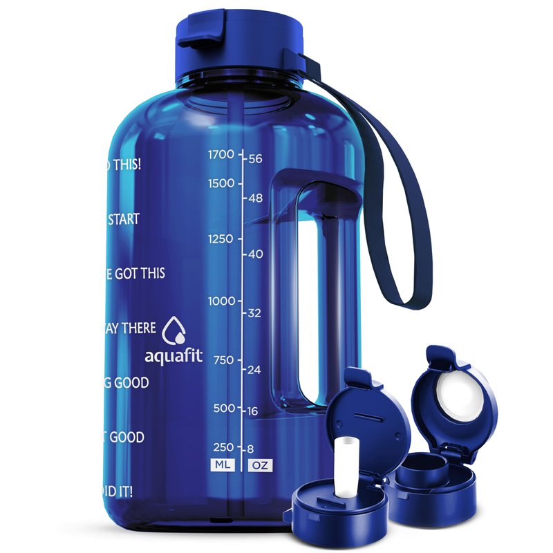 AQUAFIT Half Gallon Water Bottle With Time Marker - Straw & Chug Lid - Big Water Bottle With Straw - BPA Free Gym Water Bottle With Handle - Gallon Water Jug (Blue)
