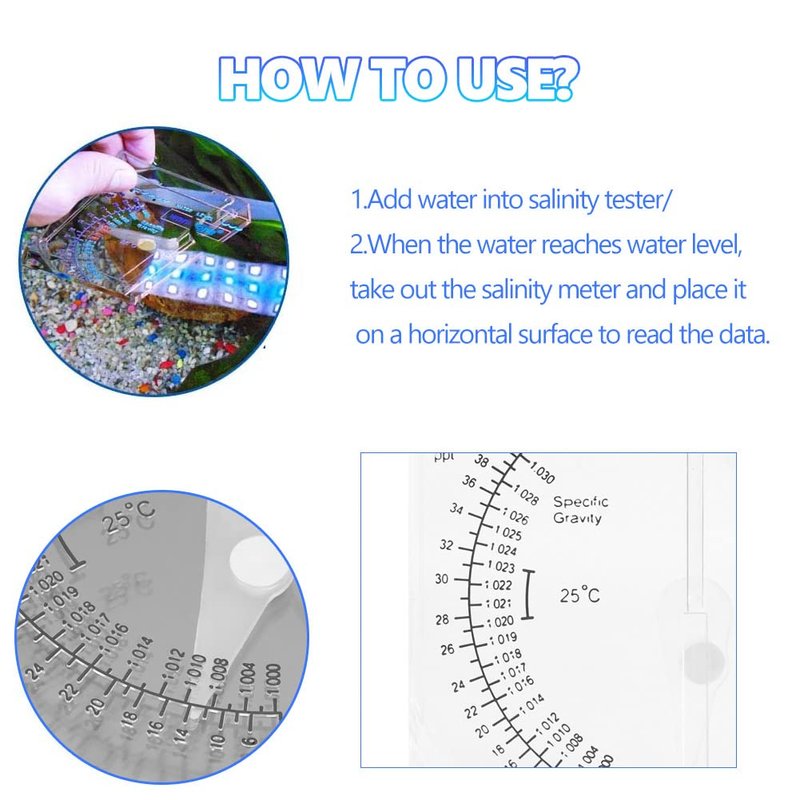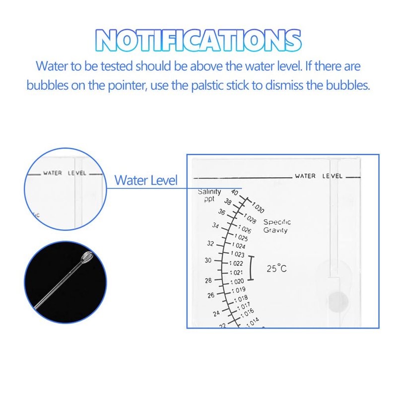 - 【Reading Scale】Based on the internal reading of the scale, based on the salinity of the horizontal scale (PPT). The recommended ratio of water in a tank is between 1,020 and 1,023 (safe range). Rinse with water after each use.