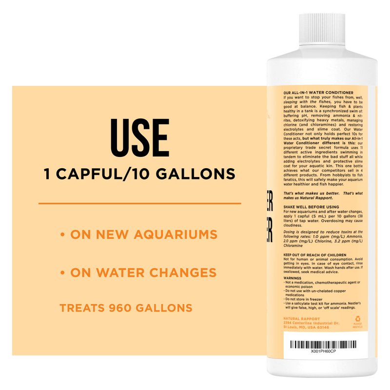Any fish owner can tell you that having a fish tank in your home can be a delightful addition to your life. However, keeping the water suitably clean can be an unpleasant and hassling chore. With the Aquarium Water Conditioner for Fish Tanks formula, you can ensure the water you add during water changes is Fish Safe Water! Add the water conditioner to tap or well water before adding it to your fish tank on water changes. This conditioner is an all-in-one solution and doesn’t need to be supplemented by a slime coat product. Remove ammonia, chlorine, chloramines, and heavy metals from water and add a slime coat and needed electrolytes in one easy step. It also buffers pH for both freshwater and saltwater tanks. By using the Aquarium Water Conditioner by Natural Rapport in your fish’s aquarium, you can save yourself time and money while providing your fish with the cleanest, clearest stress free aquatic environment!