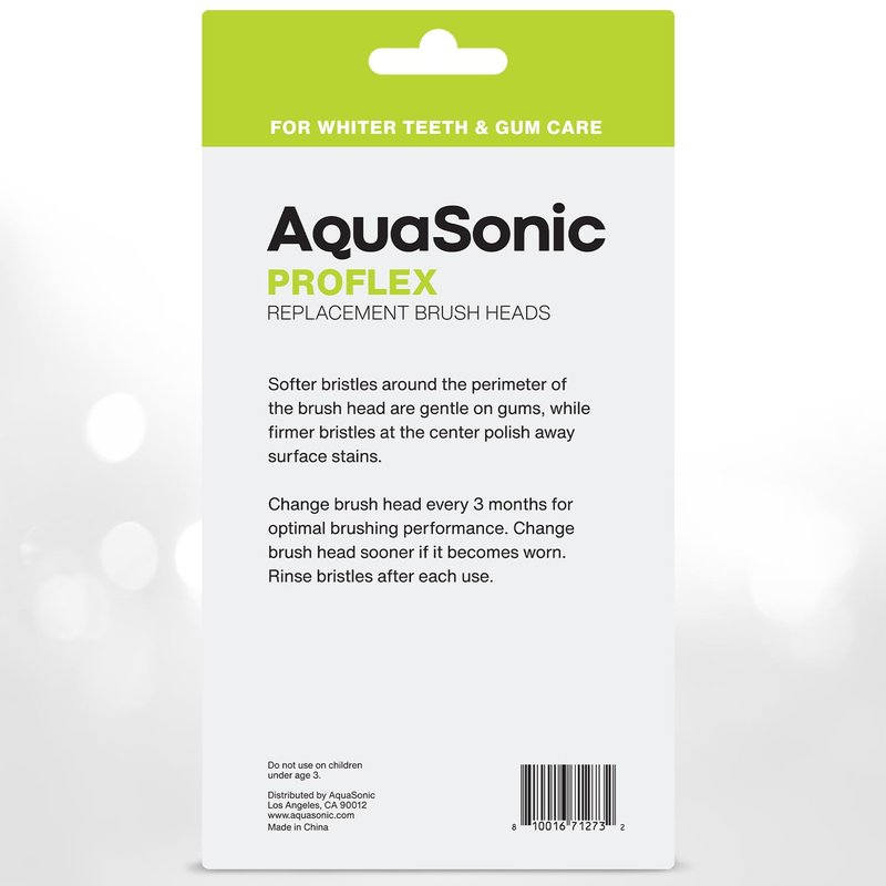 - ProFlex Brush Heads - AquaSonic's improved ProFlex Brush heads offer improved plaque removal with precisely angled bristles with alternating hard and soft areas that are gentler on gums and slightly harder on teeth