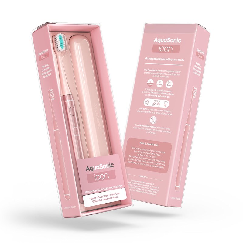 Aquasonic Icon ADA-Accepted Rechargeable Toothbrush | Magnetic Holder & Slim Travel Case | 2 Brushing Modes & Smart Timers | Modern & Convenient (Blush)
