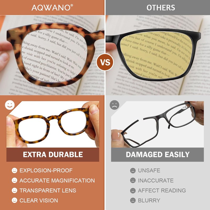 - 【Accurate magnification strength readers】- AQWANO computer reading glasses lens technology magnification error as low as ± 0.05, while the use of high-quality lenses, with high light transmission, Abbe number standard, thin lenses and not easy to scratch, both beautiful and practical