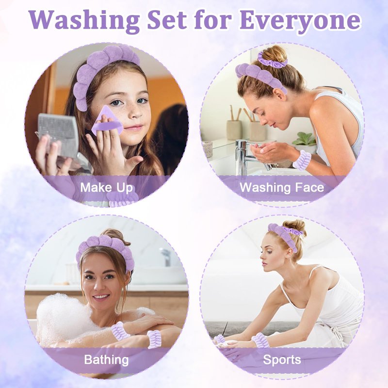 7Pcs Puffy Spa Headband for Washing Face Bubble Skincare Headbands with Wristbands Scrunchies Powder Puffs Sponge Spa Makeup Headband Puffy Headband Terry Cloth Headband for Mask Makeup Removal-Purple