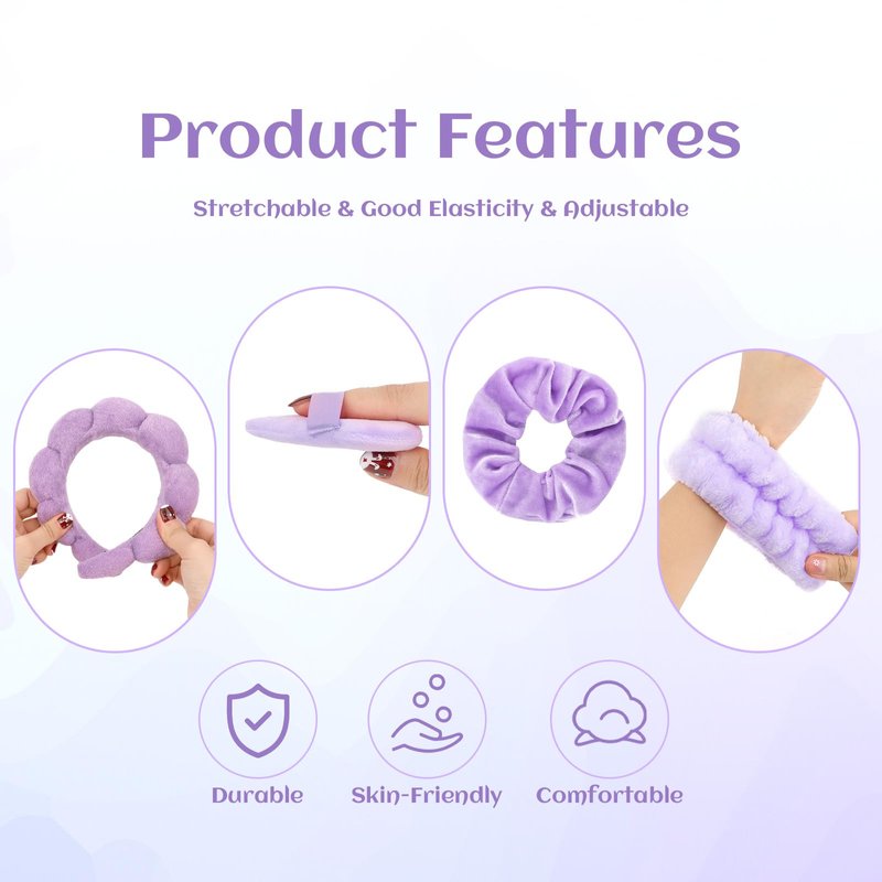 Araluky 7Pc Puffy Spa Headband and Wristband Set Skincare Headband for Washing Face Scrunchies Powder Puff Sponge Spa Makeup Headband Puffy Headband Terry Cloth Headband for Mask Makeup Removal-Purple