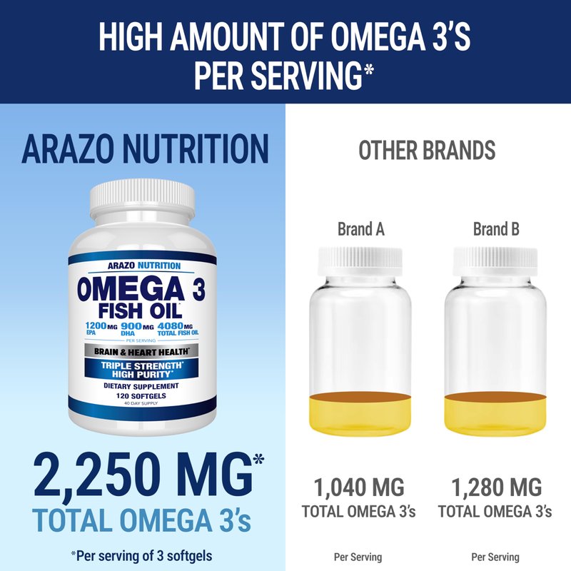 - EXTRA POTENT: High dose of 4,080mg Omega 3 fish oil, higher EPA and DHA levels than other brands with a total of 2,250mg Omega 3 fatty acid content per serving of 3 Soft Gels