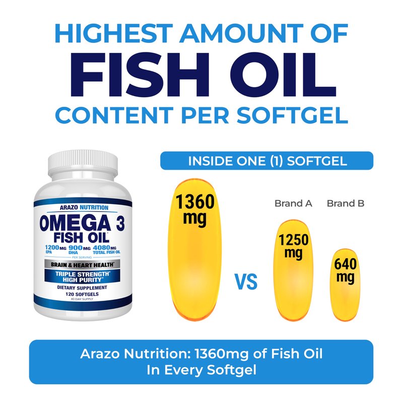 Arazo Nutrition Wild Caught Omega 3 Fish Oil – 120 Soft Gels – 4,080mg High EPA 1200mg DHA 900mg Lemon Flavor Burpless Softgels