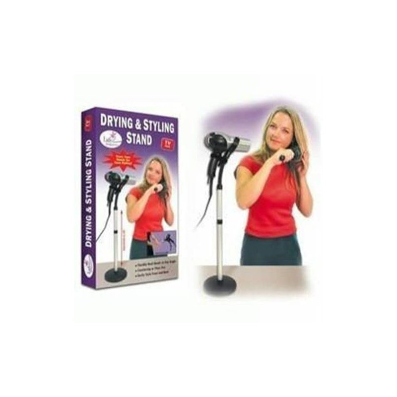 For This amazing styling stand holds hair dryer, leaving both hands free for styling with brush and comb. It's the third hand you always needed! Adjusts from 27' to 39' for use on the floor or counter top. Includes a hook and loop strap to secure odd sized hair dryers, too! Frees your hands for easy Styling! Flexible neck bends to any angle Counter top or floor use Easily Style front and back Ideal for drying nails Hair dryer is not included this is just the holder stand only