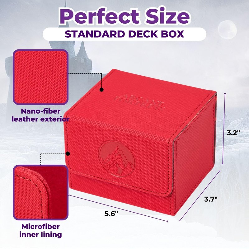 Unleash the full potential of your card collection with the Arcane Fortress MTG Deck Box—the first deck box on Amazon to feature an intricately designed art interior. This stunning visual element sets our product apart, making it more than just a card deck box but a true extension of your gaming style. With a capacity to hold up to 120 single-sleeved cards, 100 double-sleeved cards, 80 triple-sleeved cards, or 240 non-sleeved cards with room for dividers and tokens, this MTG commander deck box is a must-have for serious MTG and TCG players. The interior is lined with soft microfiber, keeping your cards in pristine condition, while the unique art adds a personal touch that other deck boxes simply can’t offer. Our commander deck box doesn’t stop at aesthetics; it’s built to perform. The included leather dividers, each printed with art to match the box’s interior, provide an elegant solution for organizing your deck. Unlike competitors that use flimsy plastic dividers, our premium leather dividers are durable and stylish, enhancing both the functionality and appearance of your deck box. Designed for the modern MTG and TCG player, the Arcane Fortress MTG Deck Box is compact yet spacious, with exterior dimensions of 5.6" x 3.7" x 3.2". It easily fits in your bag while providing ample space for your deck and accessories. The strong magnetic closure ensures your cards remain secure, making it ideal for Magic: The Gathering, Yu-Gi-Oh!, Pokémon, and more. Arcane Fortress is dedicated to providing top-tier products that meet the needs of the TCG community. From its high-quality materials to its gamer-centric design, this deck box is crafted to elevate your gaming experience. Discover the difference with the Arcane Fortress MTG Deck Box—where art meets functionality.