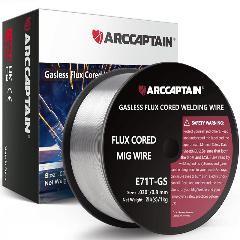 ARCCAPTAIN E71T-GS .030" Diameter 2 Pound Spool Flux Core Self-shielded Carbon Steel Mig Welding Wire AWS E71T-GS Self Shielding Gasless flux cored welding wire .030” Diameter, 2 Pound Spool Self-shielded: No need for external gas or flux.All positions, Single and multi pass welding. Good penetration, Less splash, Beautiful weld bead appearance , Easy slag removal Great for Welding Outdoors or in Drafty Conditions