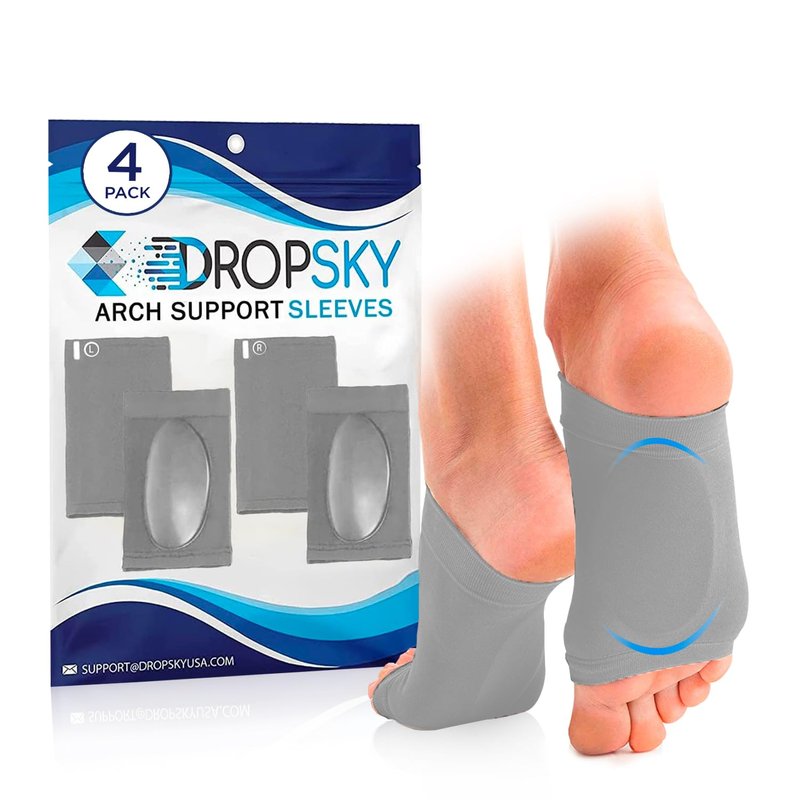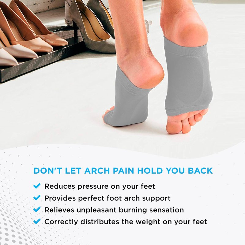 Arch Support Sleeves Soft Metatarsal Arch Support Sleeves will relieve feet pain letting you come back to normal physical form quick and easy helping with Plantar Fasciitis, Heel Spurs, Flat Feet, and other feet problems Flat feet Arch support socks are invisible Low arch support sleeves have no odors are easily and quickly washed and can be worn daily