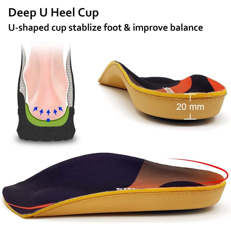 - 【ENHANCED SUPPORT】Our 3/4 length orthotic inserts stabilize and support the foot to improve alignment, relieve pain, and reduce stress on your feet, ankles, and knees. The arch support inserts help quick relief from over-pronation, plantar fasciitis, heel pain, flat foot and other common foot disease pain