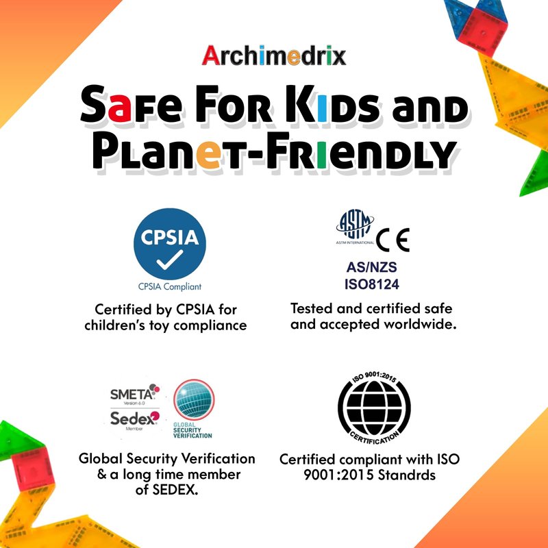 Archimedrix Geometry Magnetic Tiles are not just a toy—they’re a gateway to boundless creativity! With diverse shapes and strong magnets, children can explore their imagination and build anything they can dream up. Certified for quality and safety, our set holds an ISO 9001:2015 certificate, ensuring it meets rigorous international standards for excellence.