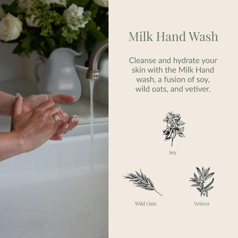 - Milk Hand Wash: Blended with dried milk solids and natural soy, oat, and rice proteins to nourish and sooth with key notes of soy, wild oats, and vetiver.