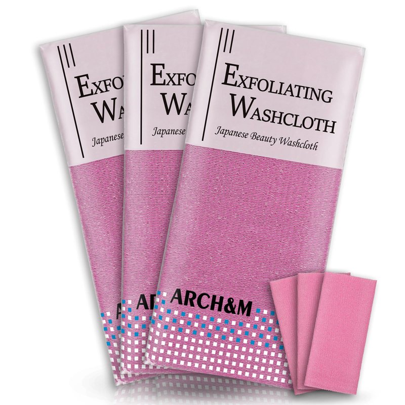 ARCH&M Exfoliating Washcloth Exfoliating Body Scrubber Back Scrubber for Shower Japanese Bath Wash Cloth Korean Exfoliating Luffah Towel Beauty Washcloth Sponge Loofah Body Scrub 3 Pack (Pink x 3)