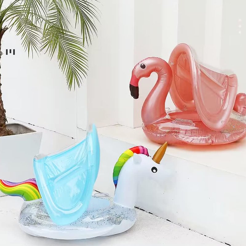 - 【Size & Suitable Age】Glitter Flamingo Baby Swimming Pool Floats outer dimension: 28.7 * 27.5 * 22.8 inches. Inflated sun canopy diameter: 37.4 * 13.7 inch. The swimming float is made for the kids of age 4-48 months years old, weighing up to 48lb. Each product is detected by gas.If you have quality problems, please contact us.