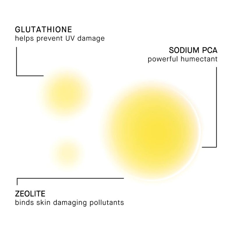Unique protective barrier serum defends against moisture loss, environmental damage and free radicals, while reinforcing daily hydration. Seal skin against pollution, weather, chemicals and free radicals with antioxidant Glutathione, Vitamins C and E. Hydrate with Sodium PCA and Glycerin, natural humectants that pull moisture from the air to alleviate skin dryness. Ideal for dehydrated, dry and lackluster skin.