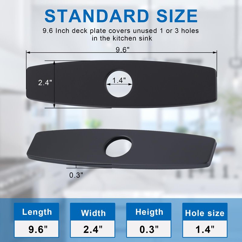 - 【Standard Size】The length of the deck plate for kitchen faucet : 9.6", width: 2.4", hole diameter: 1.4'',thickness: 0.3”,it can perfectly cover the unused outer holes of the bathroom sink.