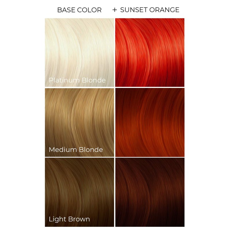 - Is it hot in here or is it just you?! Sunset Orange is a fiery, deep red-orange that turns out well on a more medium blonde! Brassy tones won’t cause any problems for this color. Since it’s primarily red-based, the red undertones of Sunset Orange may come through more strongly on hair that is more of a light blonde, around a level 9 or lighter.
