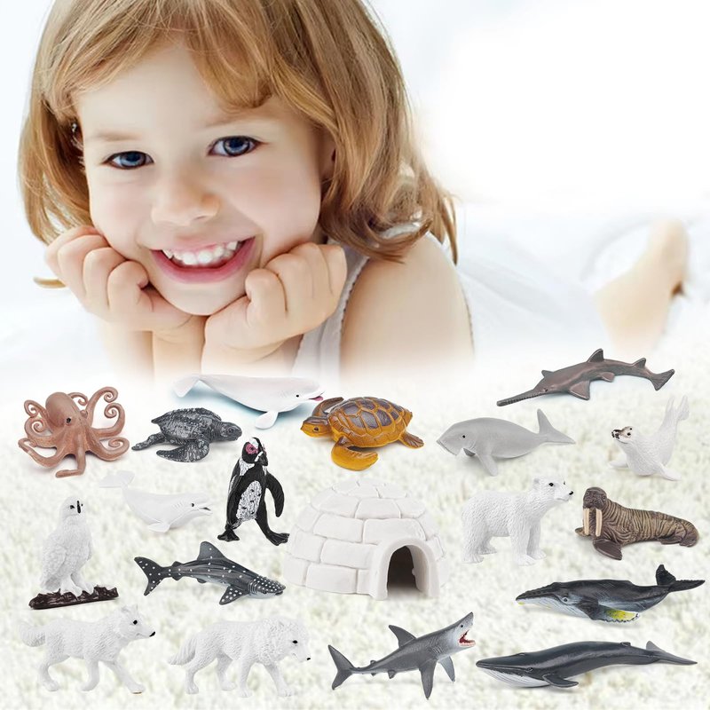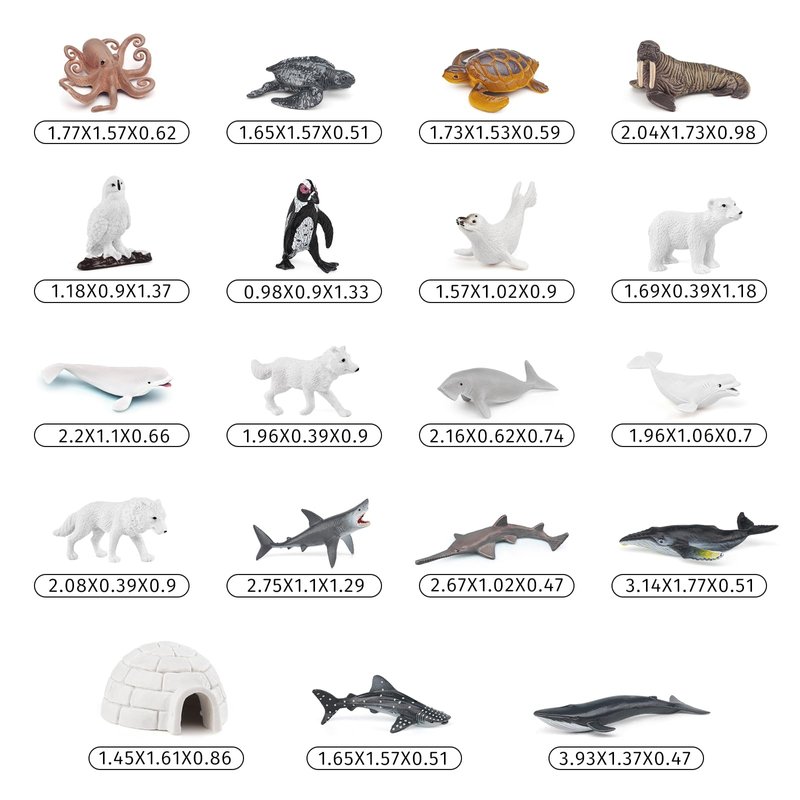 - WHAT YOU GET - 17PCS Arctic Animals Toys Set,including walrus figurine,manatee figurine,sea lion figurine,emperor penguin figurine,south african penguin figurine,leatherback turtle figurine,octopus figurine,sea turtle figurine,sea eel figurine,white wolf figurine,seal figurine,polar bear figurine,snow owl figurine,white fox figurine,white whale figurine,igloo figurine.