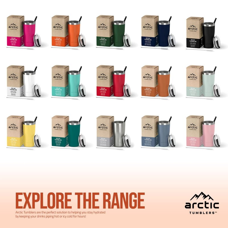 Arctic Tumbler Cup with Compatible Lid - Double Wall Vacuum Insulated - Premium Insulated Thermos Cooler- GUARANTEED to Keep Coffee HOT & Iced Tea COLD! This tumbler is great for teachers, professionals, students, kids, travelers, nurses, health care professionals, gifts/presents, the outdoors, and virtually any adventure you could dream up! Why choose the Arctic Tumbler for your beverage needs? BEST VALUE FOR THE MONEY – slim cup holder friendly design and splash and leak proof sliding lid. NO SWEAT NON-SLIP EASY GRIP AND LEAKPROOF – Carry your favorite drinks in this reusable portable container, whether it is your favorite espresso, coffee, hot chocolate, orange juice, lemonade, soda, or even beer and smoothie! MAXIMUM TEMPERATURE RETENTION – This dual purpose innovation drinkware keeps your drinks, water and other liquids piping hot or icy cold! EXTREME DURABILITY – made from Kitchen grade 18/8 steel BPA FREE & ECO FRIENDLY SEAMLESS FINISH FOR EASY CLEANING THIS TUMBLER COMES WITH OUR 100% ARCTIC SATISFACTION GUARANTEE For home, school, office, gym, sports, indoor and outdoor use, on the road, travel, hiking or hunting trip to the mountain, or a trip to the beach. ALSO AVAILABLE IN THE FOLLOWING VARIANTS: 20 oz Stainless Steel 20 oz Matte Turquoise Powder Coat Stop drinking out of an ordinary glass and start drinking straight from an Arctic cooler!