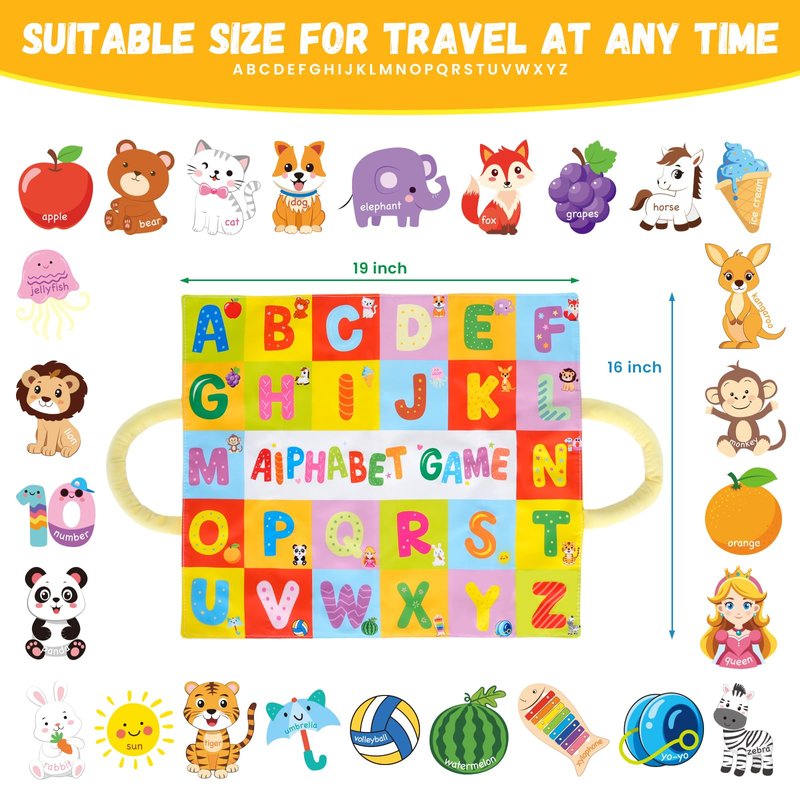 - Interactive sensory learning: Our first alphabet learning toy is perfect for young children to explore various textures and sounds in a safe and interactive way. The 26 letter-matching objects are brightly colored and housed in a dual-function organizer bag that doubles as a game mat