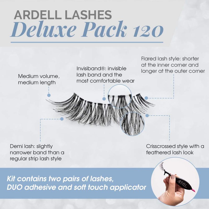 - FOUR TIMES THE GLAM! SUBTLE YET FLIRTY LASH LOOK: Ardell False Eyelashes Deluxe Pack 120 comes in four-packs! These twin sets of glamorous and natural-looking fake lashes will give life to your eyes! Made shorter in the inner corners and longer at the outer corners to give your natural lashes a sexy flared effect that many will find irresistible. It fits any eye shape and can be reused multiple times. Go for falsies that will last longer with proper care and storage - Definitely worth the price!