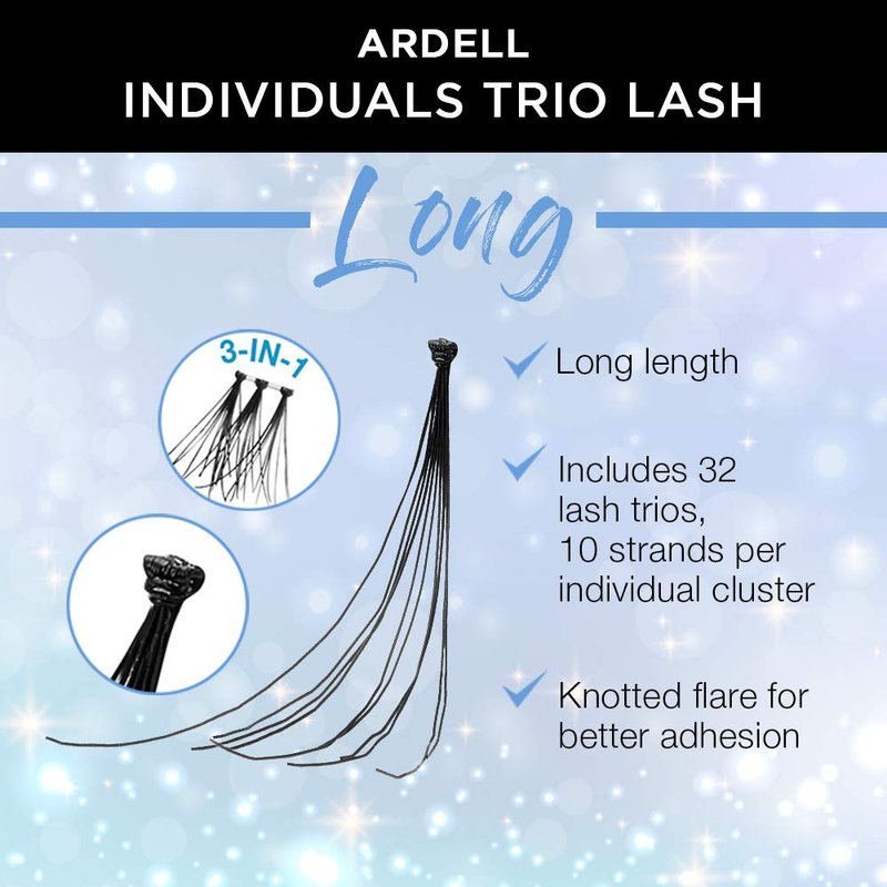 - MUST-HAVE TRIOS INDIVIDUAL FALSE EYELASH PACK: Ardell Individual Lash Trios Long Black is lightweight and very secure which will come handy especially when you’re busy and don’t have time to retouch. They will provide you superior quality false eyelashes so you’ll have an exquisite, high-end finish. Perfect for artificial eyelash extension lovers who want something exclusive and dashing to complete a dazzling makeup look.