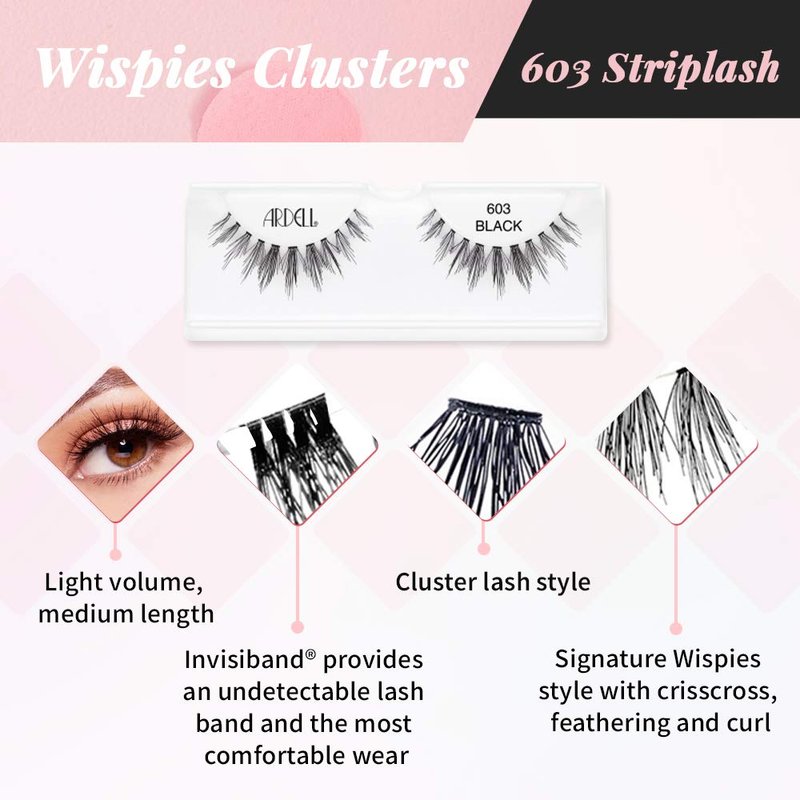 - WISPIES, FOR A DELICATE AND NATURAL LOOK: Ardell Wispies Cluster 603 are delicate looking false lash extensions designed for a perfectly natural look. They will enhance your natural eyelashes, accentuate your naturally impressive eyes and add a little extra pop to draw attention to your best features. These blinkers will help you achieve a definition and medium length to your lashes giving you an amplified, alluring yet naturally gorgeous eyes that many will find irresistible!