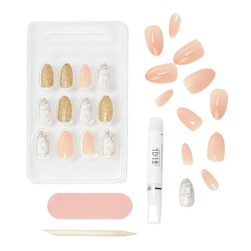 Ardell Nail Addict Premium Artificial Nail Set, Pink Marble & Gold 24-Pc, Medium-Length, Almond-Shape, DIY Press-On Nails, Quick and Easy to Use, with Glue, Cuticle Stick and Nail File