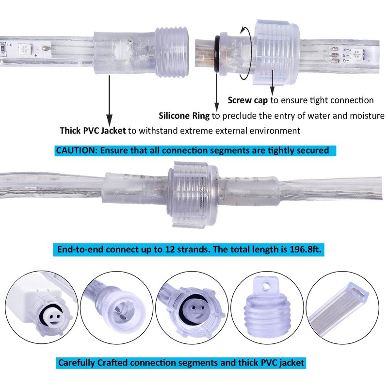 - FLEXIBLE AND CONNECTABLE: These rope lights outdoor are connectable. They can be linked up to 12 strips together (196.8ft in total). Long enough to meet your creative lighting decor needs. Plug in and enjoy the lights. Note: Cutting or extending the rope light is prohibited.