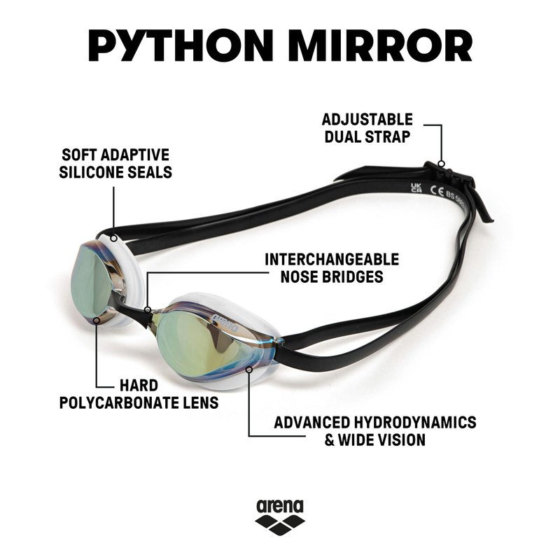 ARENA Unisex Adults Python Racing Swim Goggles for Men and Women Anti-Fog Mirror Lens Max Comfort Dual Strap, Gold/White/Black