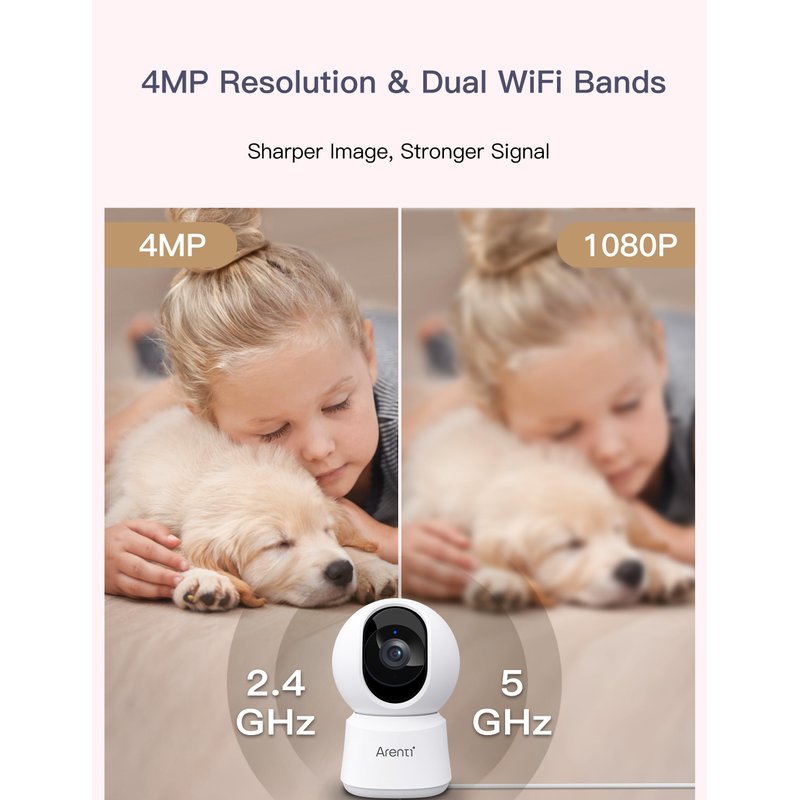 - 1 - 4MP Resolution & Dual WiFi Bands - Arenti pet camera provides 2.5K 4MP ultra clear live stream which allows you to monitor pets, babies or elderly. This WiFi camera works on both 2.4GHz and 5GHz bands to provide stronger signal and faster WiFi connection.