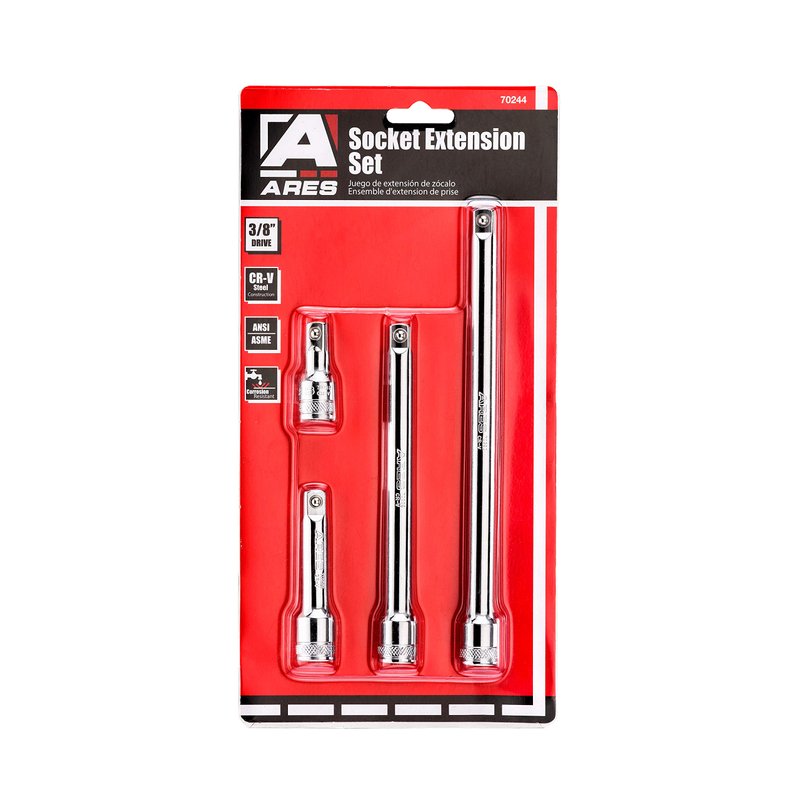 Extra Reach When You Need ItThe ARES 4-Piece 3/8-inch Drive Socket Extension Set helps give you just the right amount of extra reach whenever and wherever you need it. Made of high-strength, heat-treated Chrome Vanadium steel, these socket extensions are coated in corrosion-resistant nickel/chrome plated finish CRV, making them perfect for industrial, mechanic or construction work. With knurled bands for enhanced grip when turning loosened fasteners by hand and a spring-loaded detent ball to ensure a perfect fit, these socket extensions won't let you down. Features: Includes: 4 pc. Socket extensions3/8-inch driveSizes: 1 3/4-inch, 3-inch, 6-inch and 8-inchMade of high-strength, heat treated Chrome Vanadium steelCorrosion-resistant nickel/chrome plated finish CRV coatingKnurled bands for enhanced gripSpring-loaded detent ball ensures secure fitExtensions meet and exceed ANSI/ASME standards