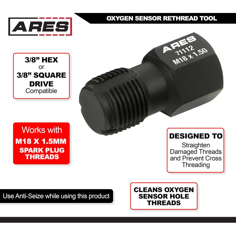 Easily Clean Oxygen Sensor Hole ThreadsThe ARES Oxygen Sensor Rethread Tool allows you re-tap oxygen sensor threads easily to straighten damaged threads and prevent future cross threading. This versatile rethread tool can be used with a 3/8-inch hex socket or 3/8-inch square drive ratchet and makes it easy to keep your vehicle running smoothly. Features: Includes: 1 pc. Oxygen sensor rethread toolWorks with M18 x 1.5mm spark plug threadsFor use with 3/8-inch hex socket or 3/8-inch square drive ratchetCleans oxygen sensor hole threadsDesigned to straighten damaged threadsPrevents cross threadingUse Anti-Seize while using this product