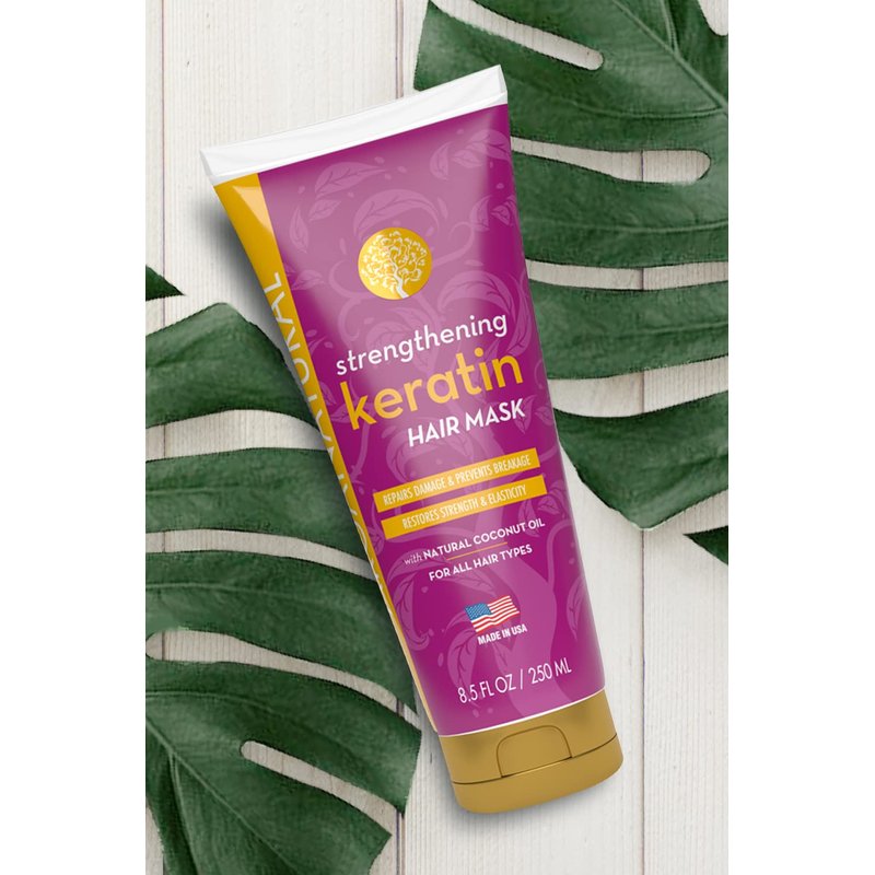 Arganatural Strengthening Keratin Hair Mask 250ml / 8.5 fl oz Tube. This hair mask has a light Apple Blossom scent that is very gentle and pleasant. CLEAN BEAUTY PROMISE: Recyclable materials, Giving Back, Made in the USA, No animal testing, Paraben free, Family Owned, No harsh chemicals, Natural ingredients.