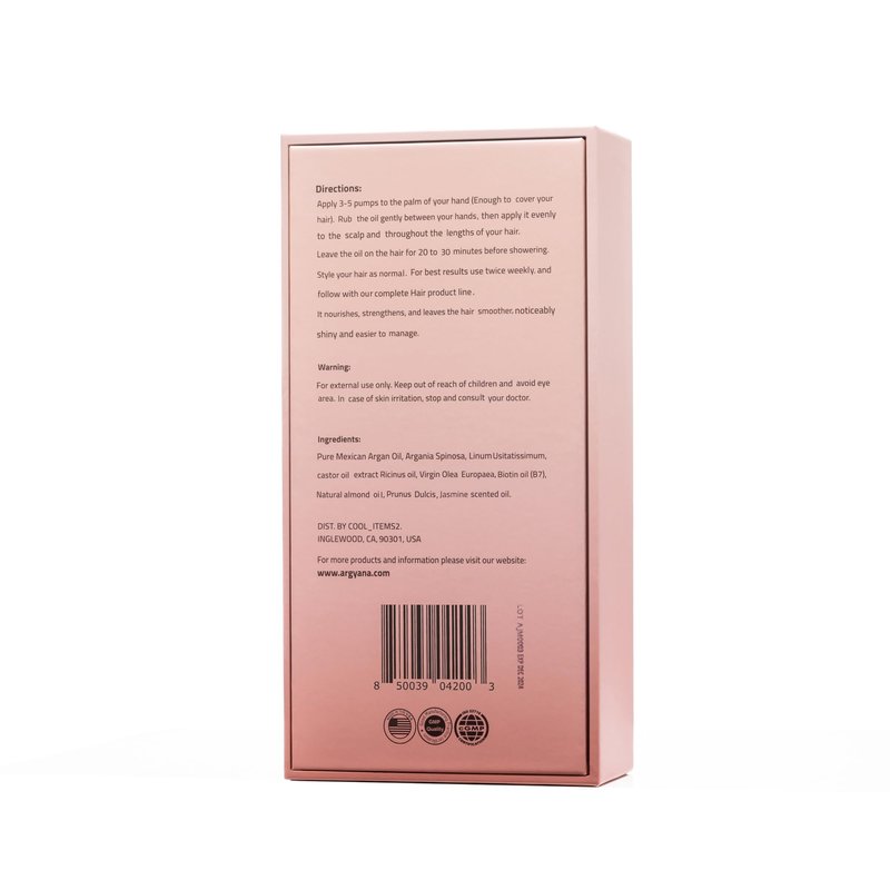 Argyana Hair Oil Mask comes with ISO and GMP Certificate and Tested Carefully in the modern American Labs. It is Created Exclusively to Suit the Structure of Women Hair, Scalps, and their Unique needs. Argyana Hair Oil Mask is available in three Heavenly and Lovely Mild Natural Fragrances. It Contains an Elaborately considered Doses of Pure Mexican Argan oil (Argania Spinosa), Flaxseed Oil (Linum Usitatissimum), Castor Oil (Extract Ricinus Oil), Olive Oil (Virgin Olea Europaea Oil), Jasmine Scented Oil. The Mexican Argan Oil is a Natural Protector for your hair, it Protects the hair from Sun Damage and Heat. It is also Rich in Antioxidants and Vitamin E Which Boosts Scalp Health, thus Promoting the Health and Thickness of Hair. The Flaxseed Oil: it Acts as an Anti-Drying Agent for Hair because it possesses enormous moisturizing abilities with vitamins and fatty acids that can hydrate the hair, improve the strength of weak follicles, and improves elasticity. The Castor Oil Increases Blood Circulation in Scalp Which Aids in Providing the Essential Nutrients for Growing your hair. It Effectively Treats Dry and Flaky Scalps because its Moisturizing and Softening Properties and Helps you have Longer and Thicker Hair. The Virgin Olea Europaea is another Moisturizing oil which Loaded with the Goodness of Antioxidants and Vitamin E. the Presence of Oleic Acid Allows the Oil to Deeply Nourish the Hair from its Roots to Make It Visibly Softer, Healthier, and Smoother. The Biotin Oil (B7) Simulates a Keratin Production in hair and Increase the Rate of Follicle Growth. The Almond Oil is Great for Dry and Damaged Hair It works as an Excellent Repairing Agent as it Contains Fatty Acids and many other Essential Hair Promoting Proteins. The Magnesium Presented in Almond Oil Helps in Fighting Against Hair Thinning and Hair Loss.