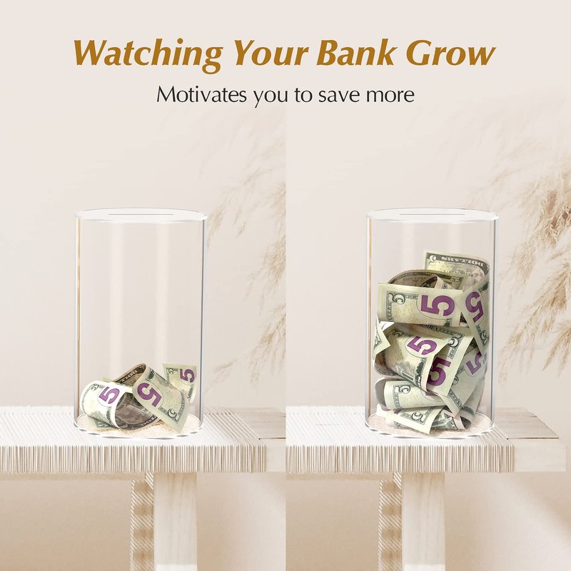 - ✔ Premium Acrylic Material - Compared with the fragile glass,ceramics and hard-to-open stainless steel, our piggy bank made of highly transparent acrylic material, is sturdy to hold money and easy to break up when goal completed.