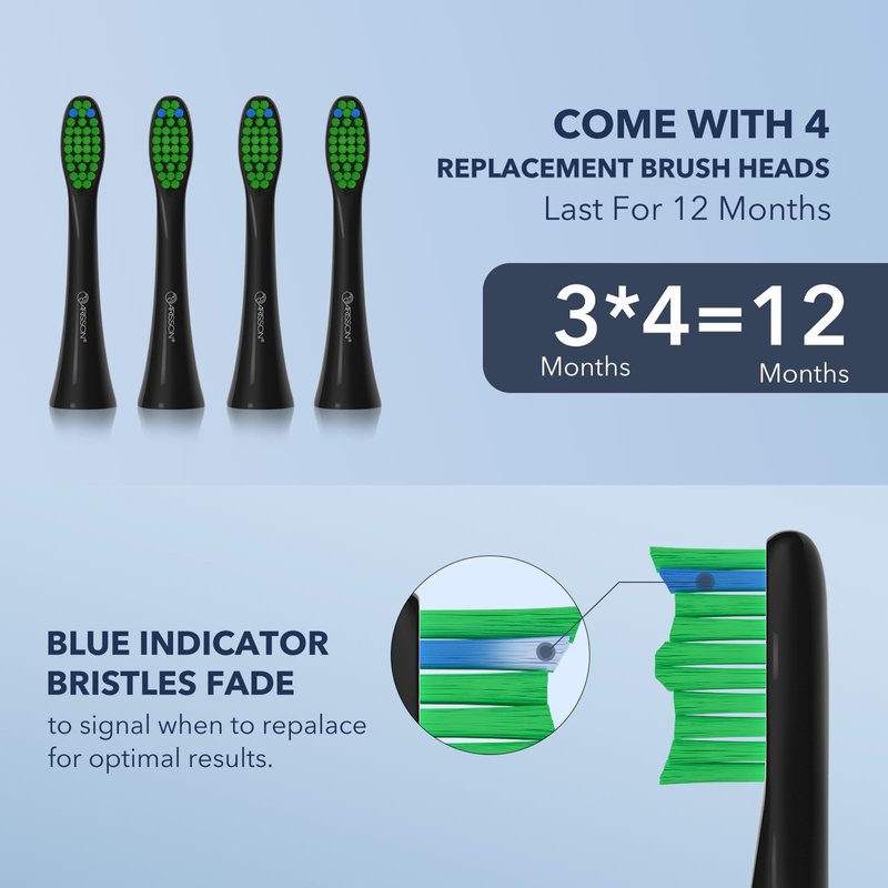 - 【"W" shape design & 4 DuPont Brush Heads】--- More comprehensive and gentle cleaning experience --- [1] Unique "W" shape design to suit teeth surfaces and remove up to 100% more stains from hard-to-reach spots, minimize the risk of damage to gums and tooth enamel. [2] Comes with 4 replacement toothbrush heads. Each brush head lasts 3 months so 4 heads will last for around one year.【NOTICE: Blue indicator bristles fade in color to let you know when it's time to replace the brush head】