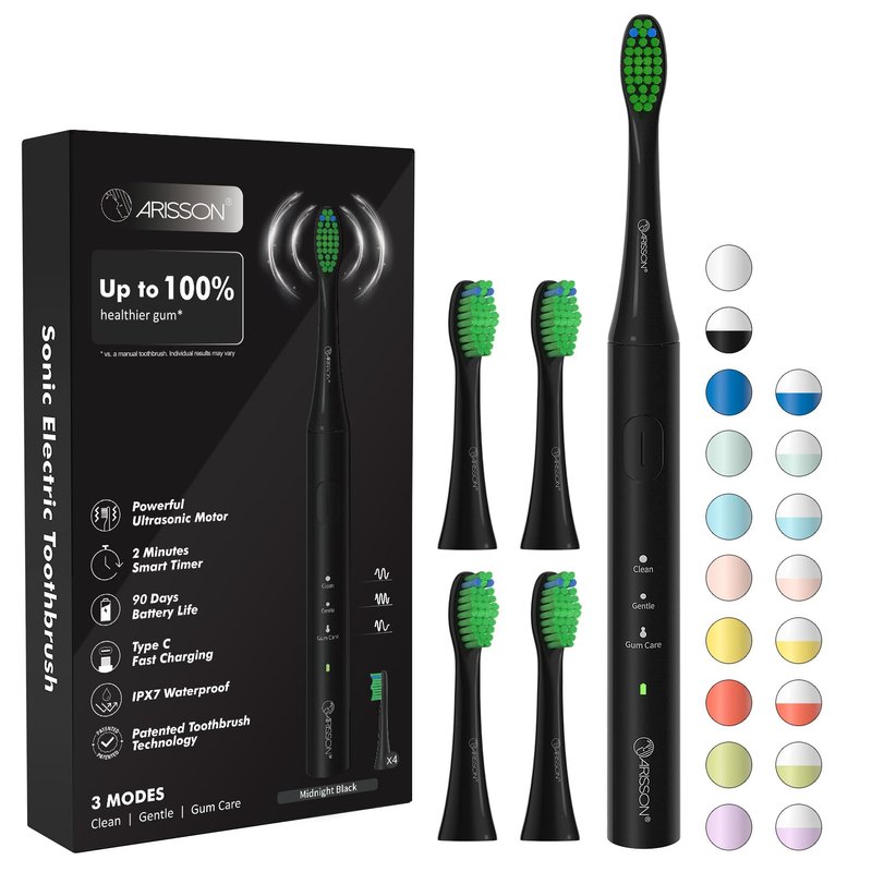 Arisson ultrasonic toothbrush features advanced sonic technology with up to 40,000 vibrations per minute, using rapid and powerful vibration to clean teeth and gums more effectively than manual brushing, which provides a powerful and effective cleaning experience.With its Type-C fast charging capability, the toothbrush can be charged quickly and efficiently. It also offers three different brushing modes (Clean, Gentle and Gum Care) for customized brushing and four DuPont brush heads for a comprehensive and cost-effective cleaning experience. The Arisson toothbrush's unique W-shaped design and end-rounded filaments ensure gentle cleaning and protection of gum tissue, while effectively cleaning hard-to-reach areas. Experience a deep and thorough clean for optimal oral hygiene with Arisson ultrasonic toothbrush!
