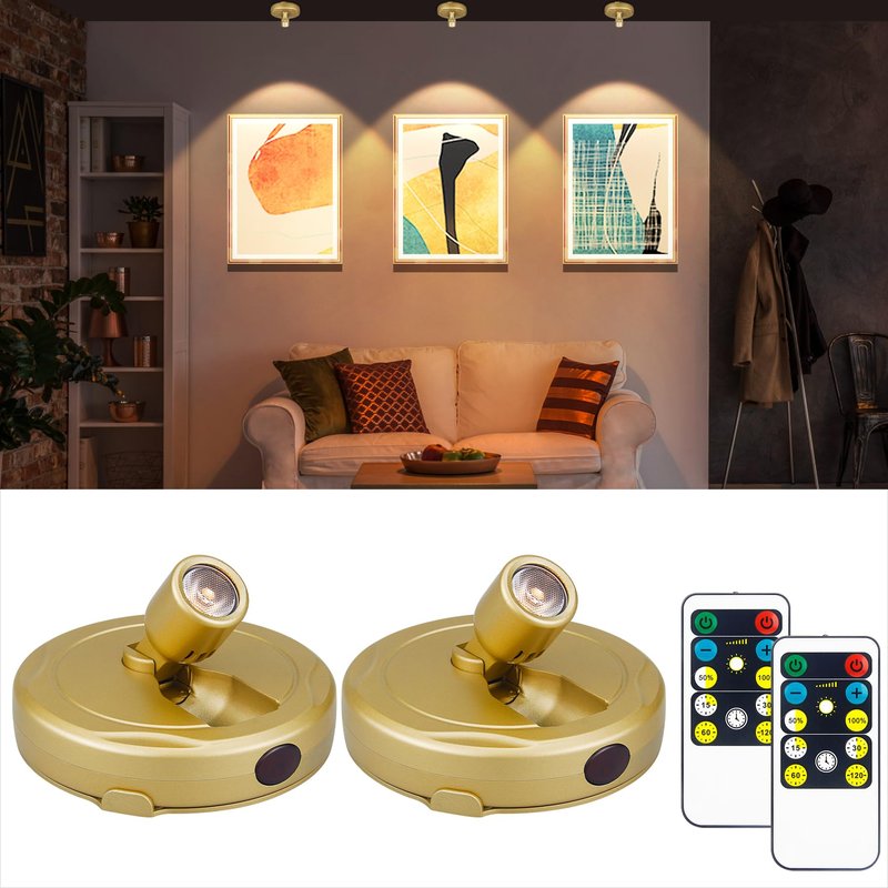 Arixinks 2Pack Battery Spotlight with Remote Gold, Wireless Led Picture Lights Painting Light for Wall Art,Uplight Puck Lights for Plants Indoor Art Display Light, Ceiling Spot Light Accent Light