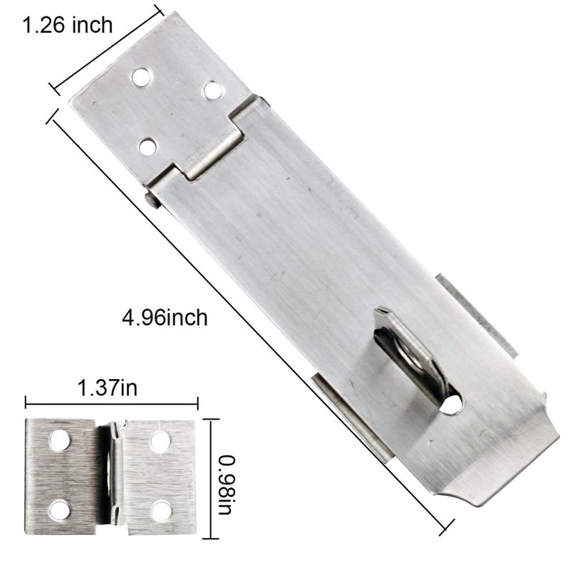 - Hasp lock latch Size: hasp lock 4.96*1.26 inch, Iron padlock 1.45*1.29 inch, good quality, well made, No sharp edges.